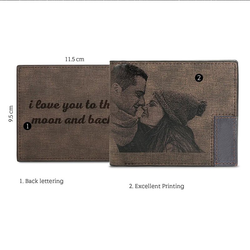 Gestalten Sie Ihre eigene personalisierte Brieftasche mit einer einzigartigen Gravur, die sowohl Ihr eigenes Bild als auch Ihren Wunschtext enthält. Diese Geldbörse bietet Ihnen die Möglichkeit, Ihr eigenes Bild und den gewünschten Text auf der Vorderseite anzubringen, wodurch die Brieftasche zu einem ganz besonderen und individuellen Accessoire wird. Die hochwertige Gravur verleiht der Geldbörse eine persönliche Note und macht sie zu einem einzigartigen Geschenk oder einem besonderen Stück für Sie oder Ihre Liebsten.