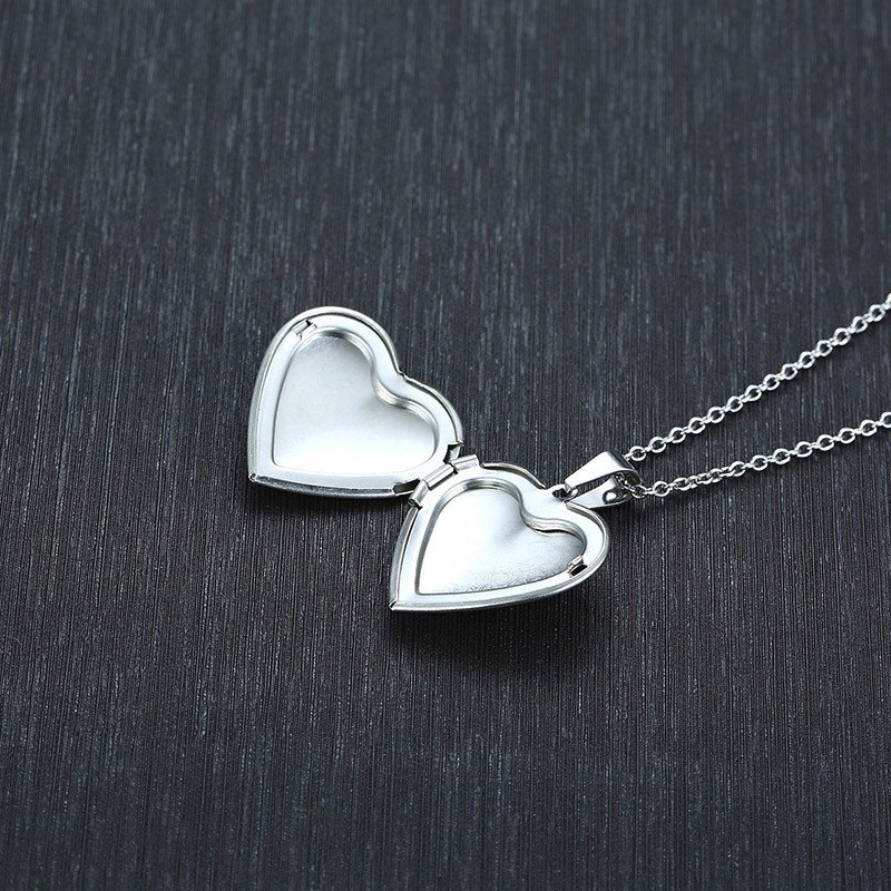 Die personalisierte Medaillon-Halskette besteht aus hochwertigem Edelstahl und ist in den Farben Silber oder Gold erhältlich. Der herzförmige Anhänger lässt sich öffnen und bietet im Inneren Platz für zwei persönliche Fotos, die auf den Innenseiten eingefügt werden können.